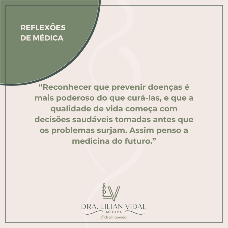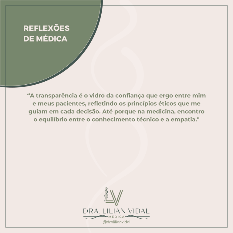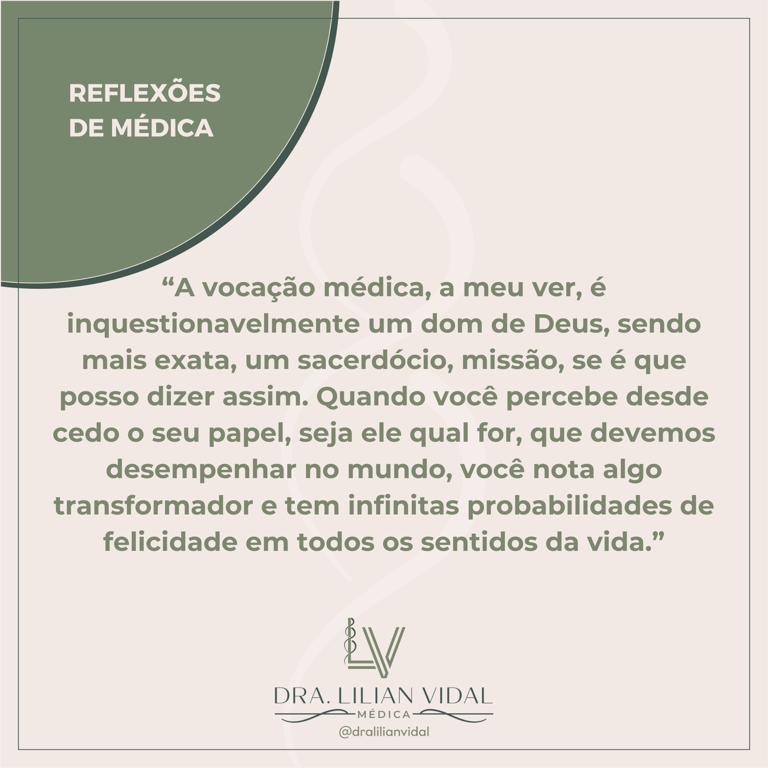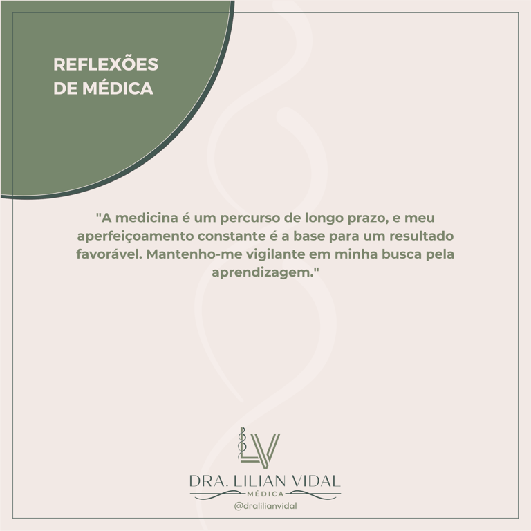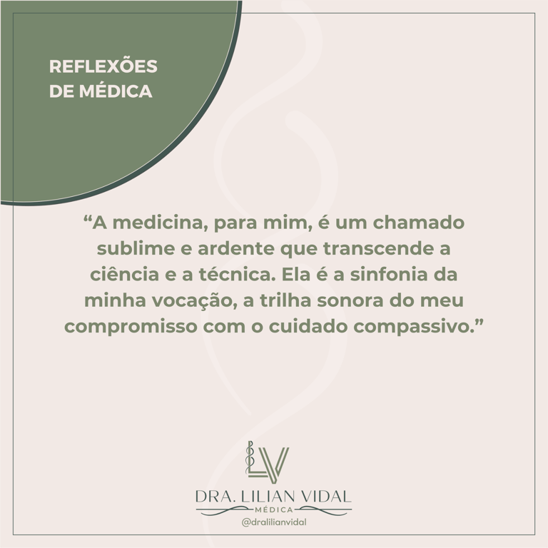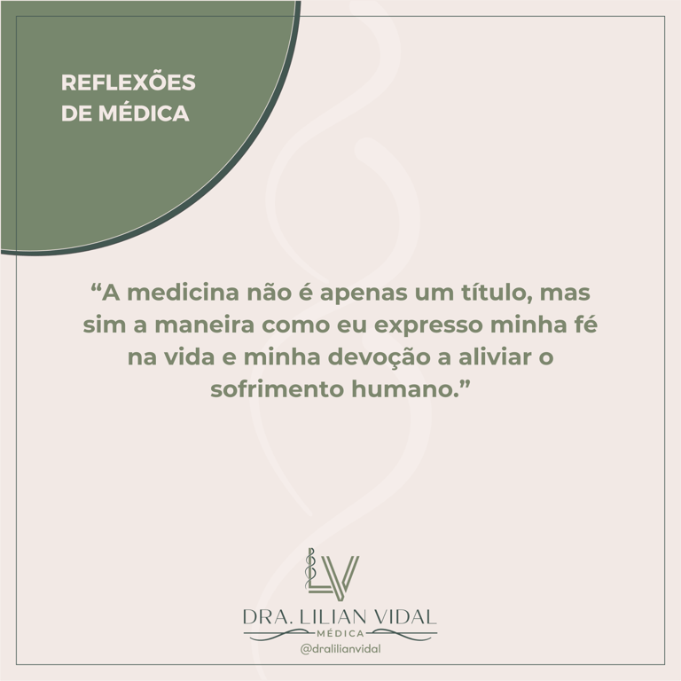 Um mergulho nas profundezas do universo médico através de citações pessoais e ponderações sobre o passado, o presente e o futuro da medicina. Como médica, Dra. Lilian Vidal tem a honra dividir com vocês seus entendimentos sobre sua vocação, a incumbência do médico na sociedade, a evolução constante da medicina, entre outros assuntos. As frases proferidas pela médica pretendem expressar o empenho com o cuidado compassivo, as inovações que moldam sua profissão e o interesse em melhorar a vida das pessoas. Cada citação é uma janela para a mente, oferecendo um vislumbre do que move e motiva esta jornada de compreensão. Convidamos vocês a explorarem essas reflexões, esperando que encontrem nelas um eco das suas próprias percepções sobre a área médica.