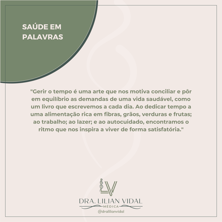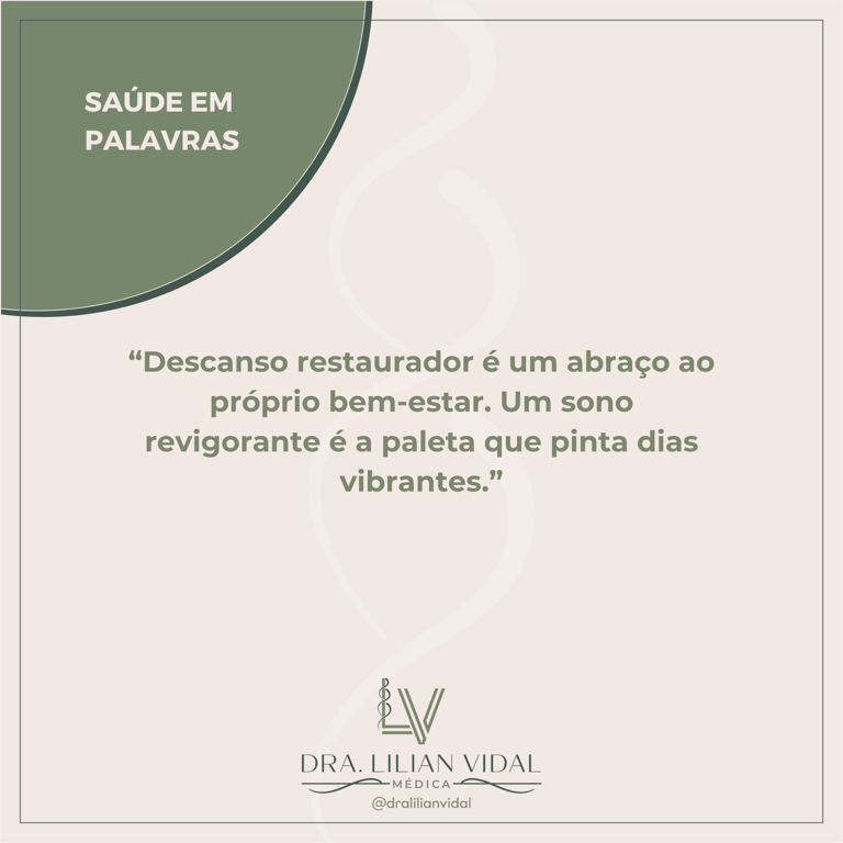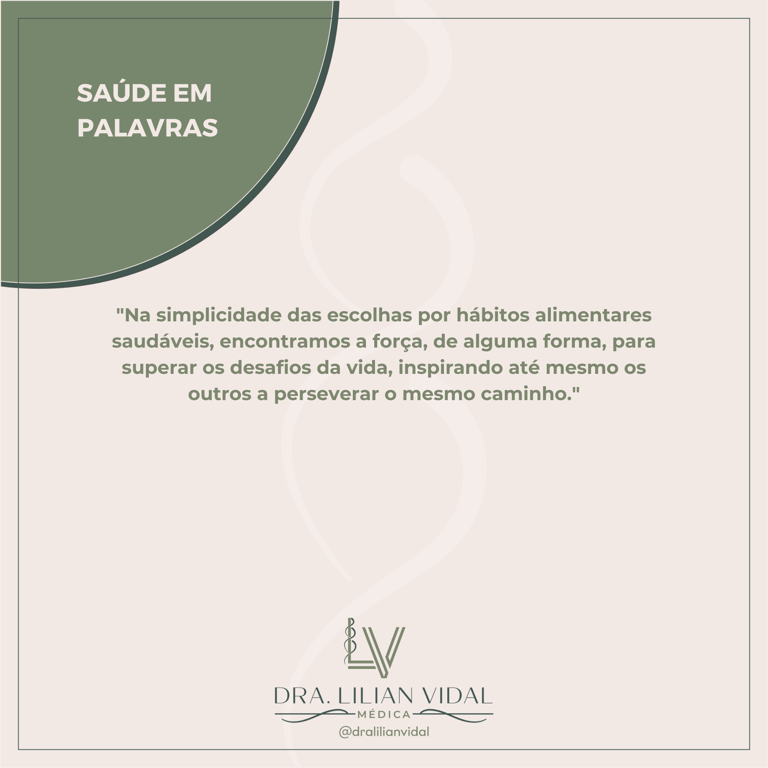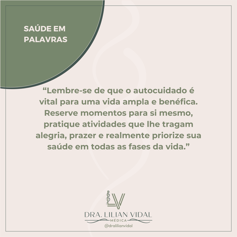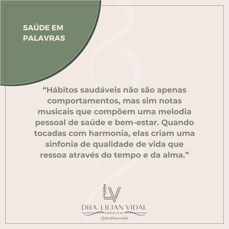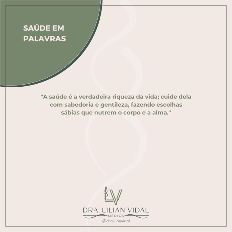 Um ambiente onde a essência da medicina se entrelaça com a inspiração e o conhecimento. Aqui, você encontrará uma seleção de frases cuidadosamente elaboradas para informar sobre a relevância dos cuidados com a saúde. Cada frase é uma pequena cápsula de sabedoria, destinada a incentivar escolhas saudáveis e a conscientização sobre a vitalidade do nosso bem-estar. Como médica envolvida com a missão de promover qualidade de vida, Dra. Lilian Vidal encontrou neste espaço a oportunidade de compartilhar pensamentos que possam conduzir uma vida mais saudável e harmoniosa. Sinta-se à vontade para explorar e absorver essas palavras como uma dose de inspiração para o seu dia a dia.