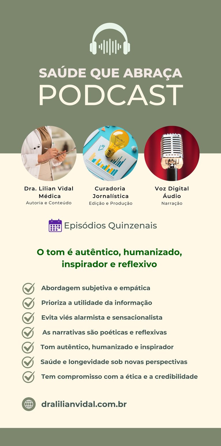 · A Contribuição: Para o ouvinte, essa convergência resulta em acolhimento. O Podcast entrega clareza, transformando temas complexos em insights que promovem longevidade e saúde plena.